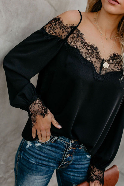 - Solid Color,Lace,Off Shoulder,Long Sleeve,Loose